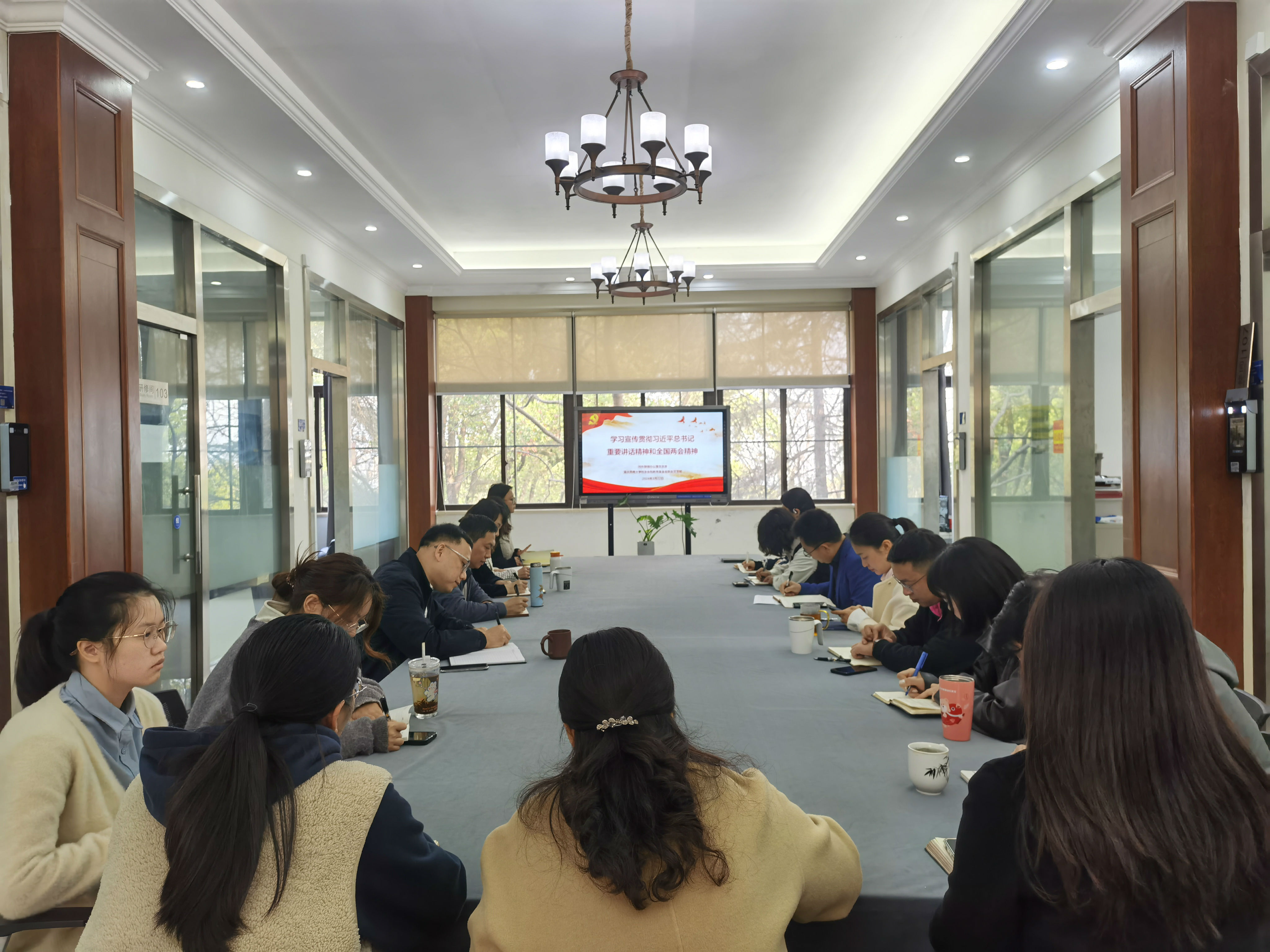 大家共同学习习近平在参加江苏代表团审议时的讲话精神、习近平在看望参加政协会议的民革科技界环境资源界委员时的讲话精神、政府工作报告等。