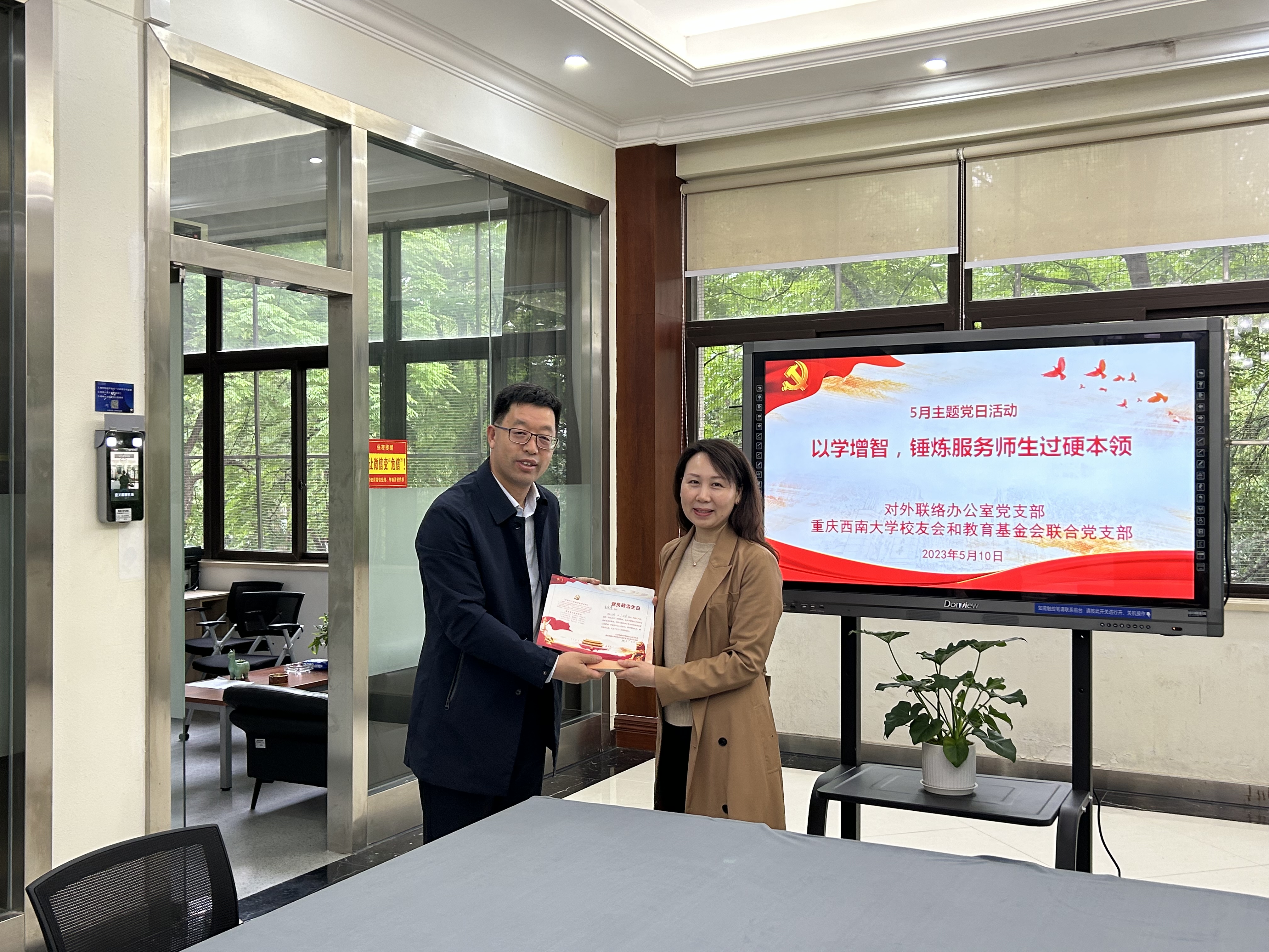 2023年5月10日下午2:30,对外联络办公室5月主题党日活动暨党员大会在北区图书馆逸夫楼1楼召开。活动主题是:以学增智,锤炼服务师生过硬本领。党日活动由支部书记唐军同志主持。