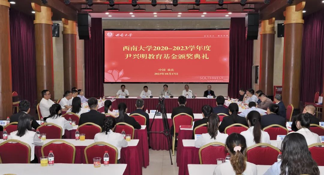 2023年10月17日下午,2020—2023学年度尹兴明教育基金颁奖典礼在东方红会议厅举行。学校党委书记李旭锋、党委副书记黄杰、副校长赵国华,重庆钰鑫实业集团有限公司(以下简称“钰鑫集团”)董事长尹兴明、总裁尹顺新等出席典礼,学校相关单位主要负责人及获奖师生代表参加典礼。颁奖典礼由赵国华主持。