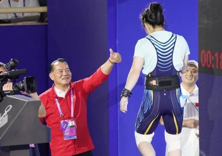 ▲罗诗芳第三次挺举试举失败后教练给她点赞以示鼓励