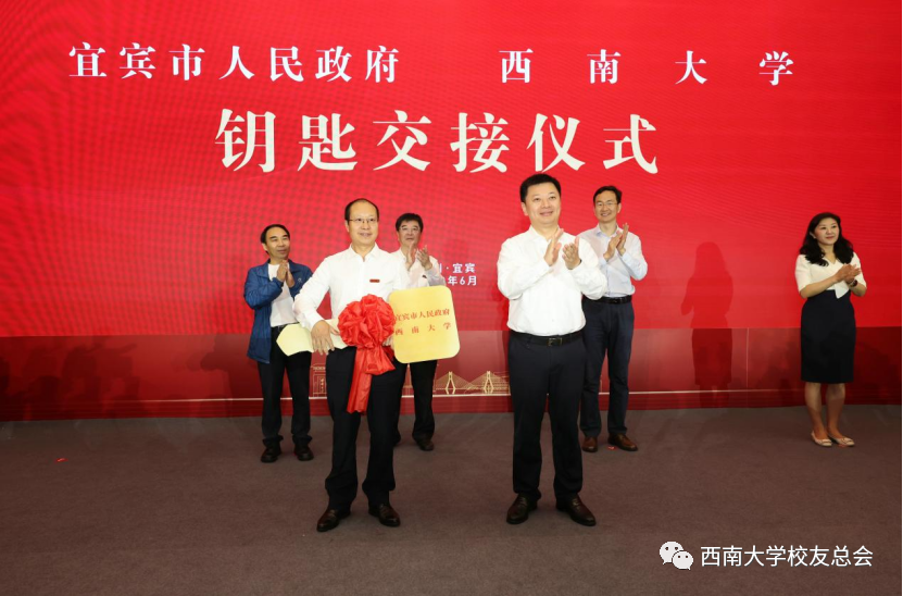 随后举行宜宾市向学校移交研究院钥匙仪式,宜宾研究院直属党支部书记、院长陈金凤从廖文彬市长手中接过钥匙。
