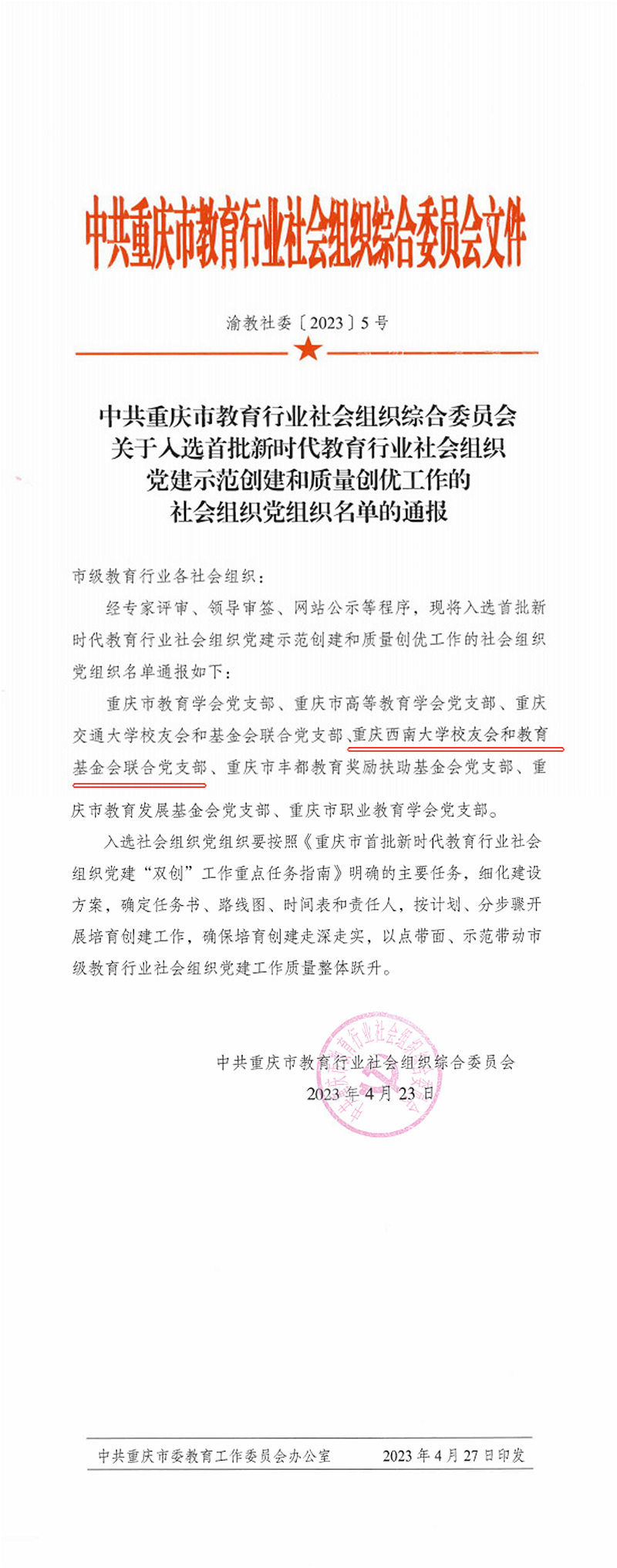 根据中共重庆市教育行业社会组织综合委员会通报,经专家评审、领导审签、网站公示等程序,重庆PA视讯校友会和教育基金会联合党支部入选首批新时代教育行业社会组织党建示范创建和质量创优工作的社会组织党组织名单。