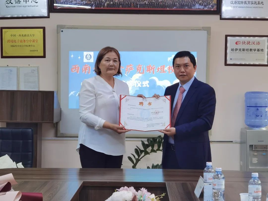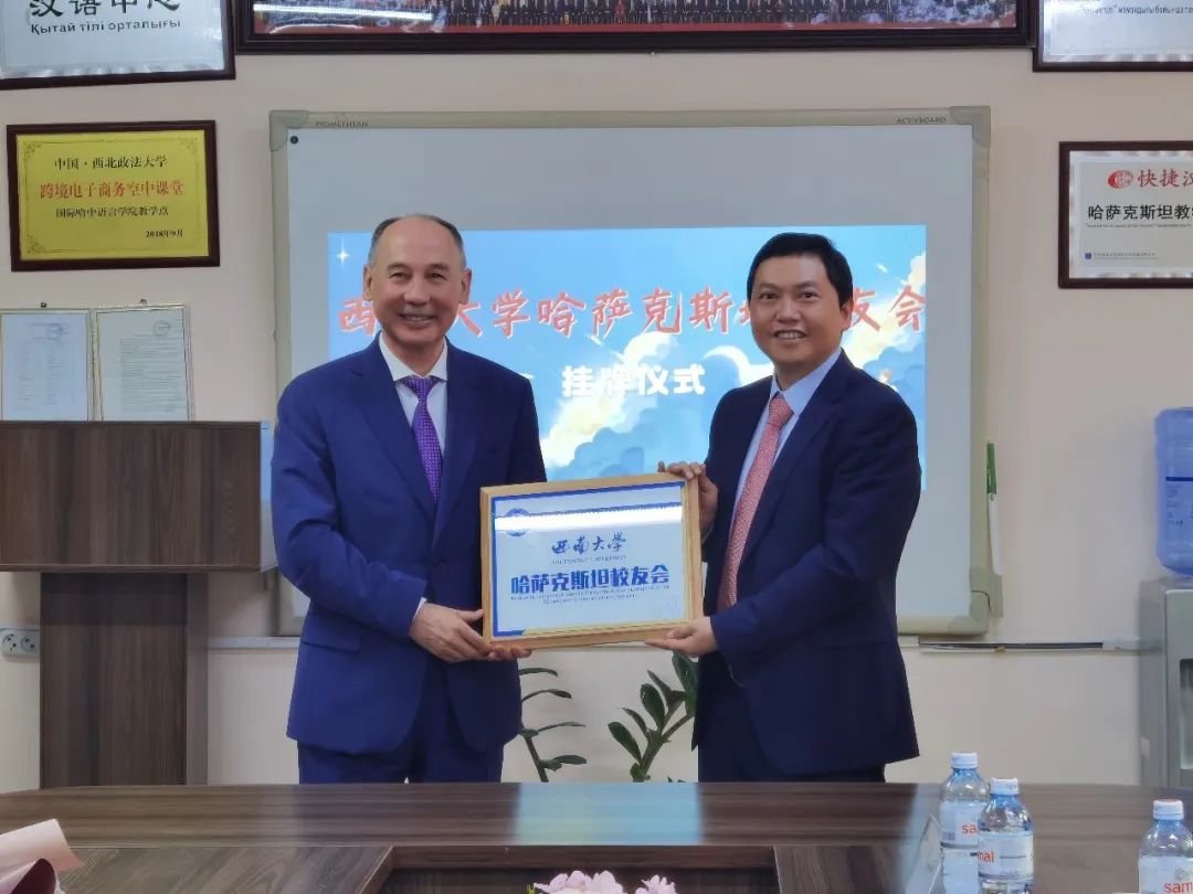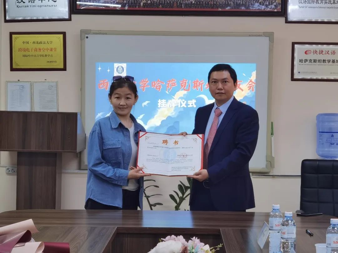 唐军为2012级教育学部沙吾列博士校友颁发校友会会长聘书、为2015级教育学部阿依江博士校友颁发秘书长聘书,聘请2014级音乐学院萨克校友担任副秘书长。国际哈中语言学院作为校友会驻地,学院校长塔勒哈特代表校友会接受PA视讯哈萨克斯坦校友会铭牌。