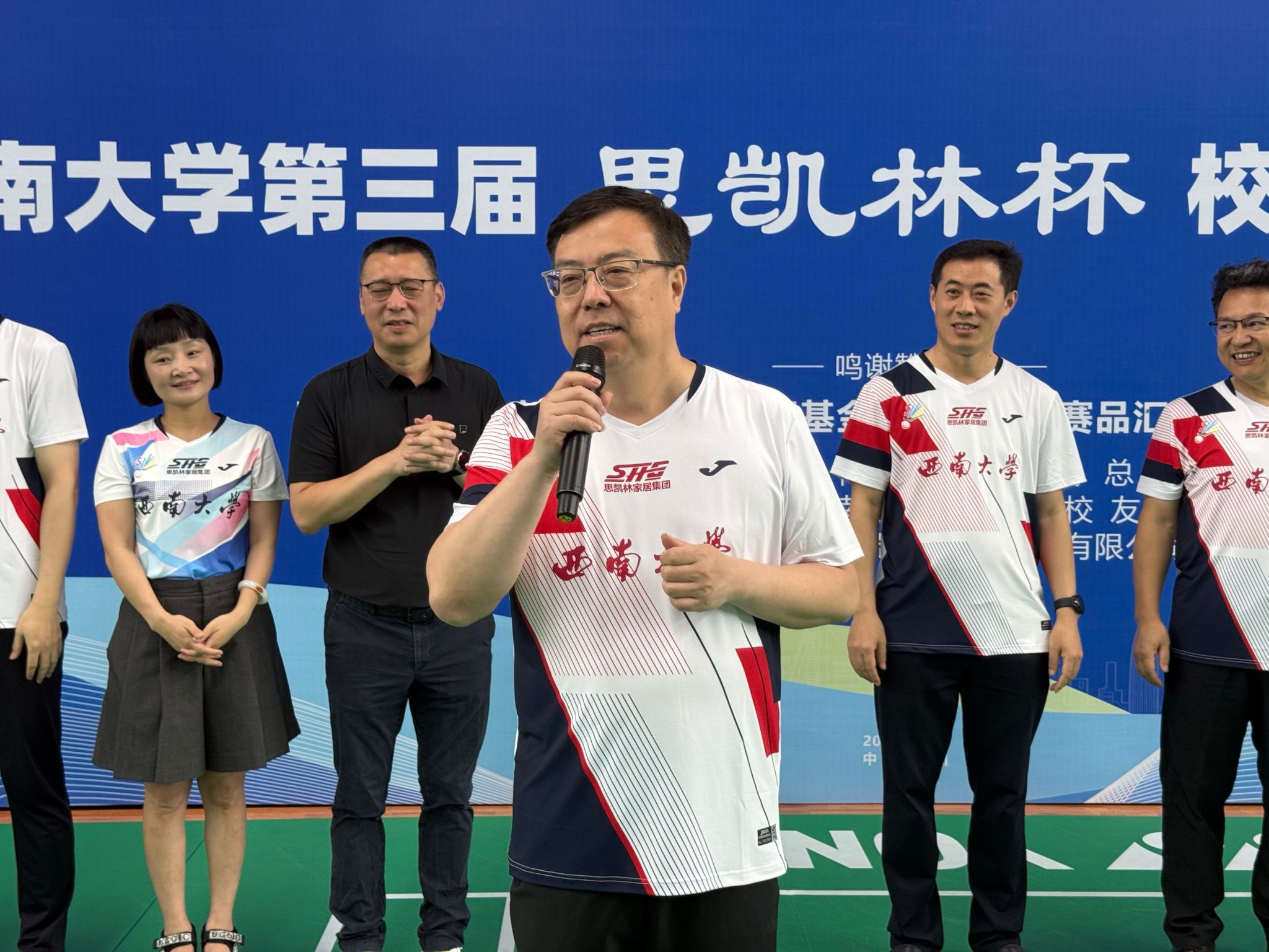白显良致开幕辞,王进军宣布本次联谊赛正式开幕,并表达了学校对本次比赛的高度重视,为校友之间团结互助、共同发展的精神给予了高度评价。王进军还参加了男子双打比赛,以体育竞技为纽带,拉近了校领导与校友之间的距离,让校友们感受到母校的亲切与关怀。