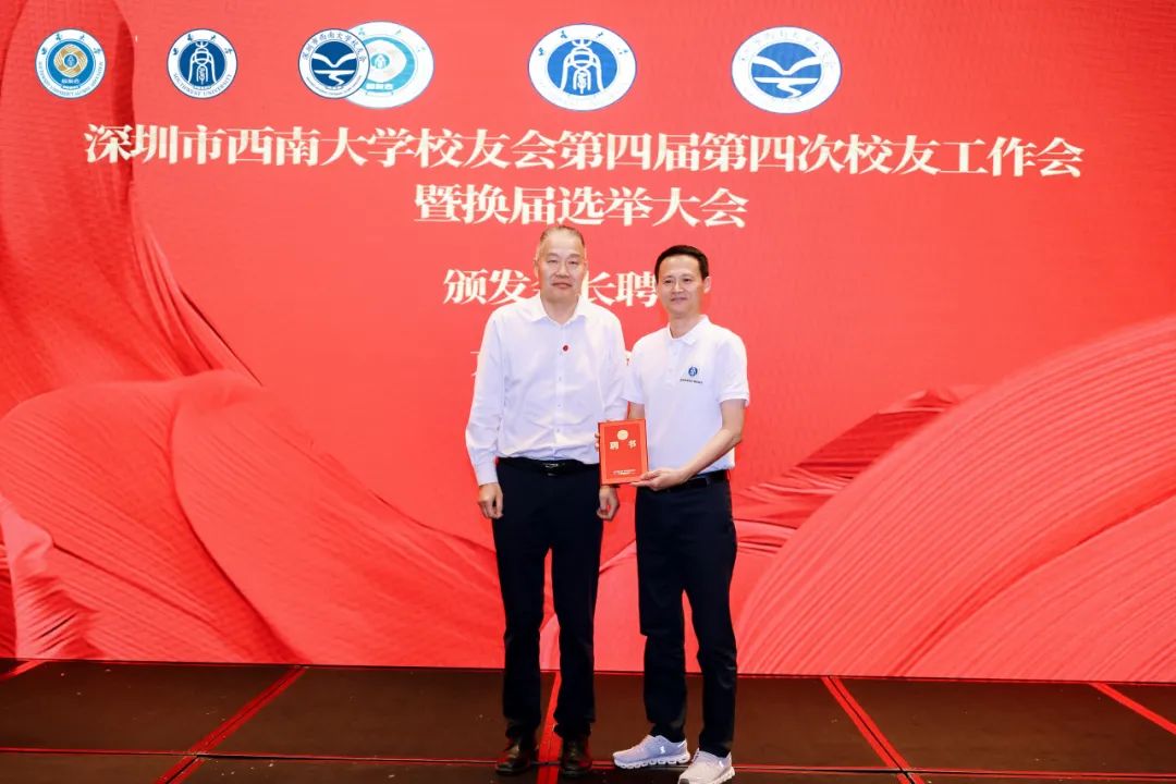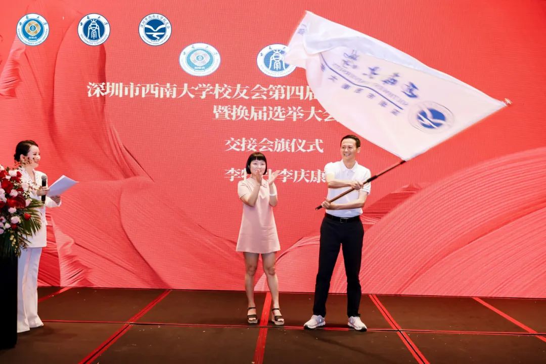 作为深圳校友会创始人,李庆康再度接过会长重任,他在发言中回顾了深圳校友会一路走来的风雨历程,感谢母校的培养和校友们的信任支持,并勾勒未来的工作蓝图。仪式环节庄重而温馨,葛信勇校长亲自为新任会长颁发聘书,前后两任会长交接会旗,象征着责任与使命的传递。