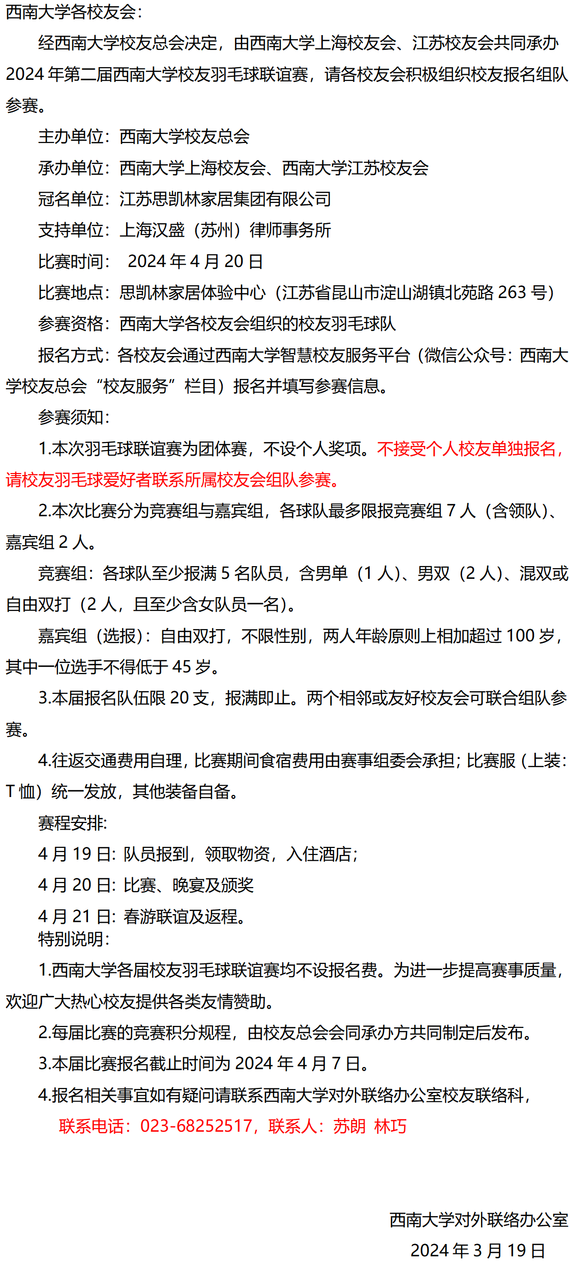 2024年“思凯林杯”PA视讯校友羽毛球联谊赛报名通知