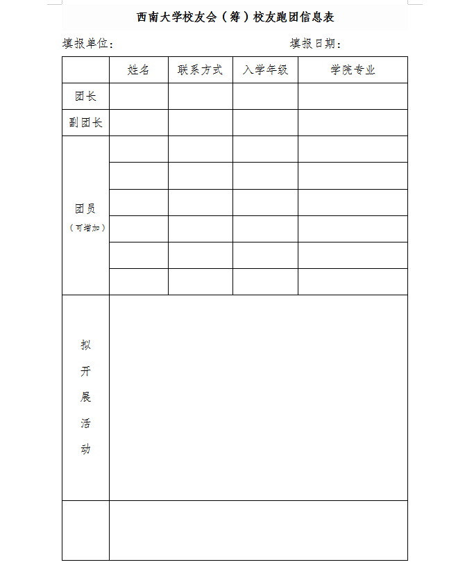 请各地校友会在7月5日前完成校友跑团的组建工作,填写附件并发送至邮箱:swuxy@swu.edu.cn(主题注明:PA视讯XX校友会校友跑团信息表)。